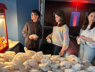 Die aktiven Schülerinnen und Schüler der SV hatten sich mehrheitlich im Vorfeld für den Film „Toy Story 1“ entschieden. Bei der Auswahl war auch hier der zentrale Gedanke, dass damit vor allem die Kinder im Alter von 10-13 angesprochen werden sollen. Und tatsächlich ging es den Schülerinnen und Schülern der SV auch diesmal gar nicht nur um den Inhalt des Filmes, sondern vielmehr um die gute Gelegenheit, Schule auch mal anders erlebbar zu machen, das Schulleben aktiv mitzugestalten und für alle Schülerinnen und Schüler einen erlebnisreichen Abend zu organisieren. Die Vorbereitungen starteten um 16:30 Uhr. Auch wenn die Stühle und die Filmtechnik schon aufgebaut waren, so mussten dennoch die Getränke, Süßigkeiten und vor allem das Popcorn vorbereitet werden. Außerdem gab es stimmungsvolle Beleuchtung, so dass sich bei dem köstlichen Duft von frischem Popcorn schnell das richtige Kino-Feeling einstellte.