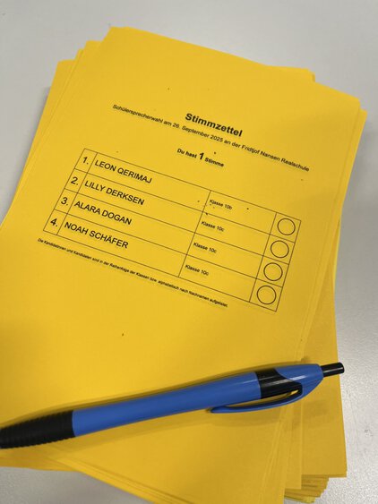Am Freitag, 26.09.2025 hat zum zweiten Mal eine Schülersprecherwahl an der Fridtjof Nansen Realschule in Form einer Direktwahl stattgefunden.