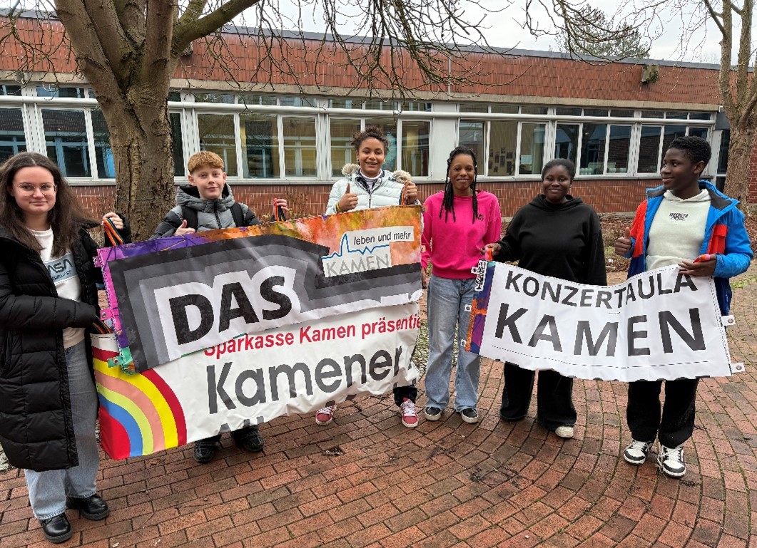 Gerade arbeiten wir an einem richtig coolen Projekt mit der Stadt Kamen. Mit Unterstützung von Frau Haake nähen wir aus alten Werbeplakaten Bewässerungssäcke für Bäume, kleine Etuis, Gefäße für Pflanzen und noch einiges mehr. Die Bewässerungssäcke sind super praktisch, weil Bäume damit wassersparend gegossen werden können. Wir verkaufen die Sachen und sammeln so Geld für neue Projekte. Wir wollen zum Beispiel mehr Sitzplätze für die Pausen bauen, neue Beete für Bienen und Schmetterlinge anlegen oder vielleicht sogar einen Teich graben.