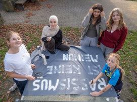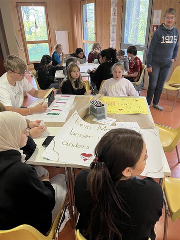 Am Donnerstag war der Kamener Bahnhof für alle der erste gemeinsame Treffpunkt. Um kurz nach 8 Uhr ging es mit öffentlichen Verkehrsmitteln erst nach Bergkamen und dann mit einem bestellten Taxibus direkt zur Ökologiestation Bergkamen. Dort erwartete uns gleich ein netter Referent im Gemeinschaftsraum, der mit uns einen interaktiven Workshop rund um das Thema Diskriminierung und Rassismus durchgeführt hat. Viele gute Beiträge, persönliche Schilderungen und viel Engagement der Schülerschaft haben diesen Vormittag insgesamt sehr wertvoll gemacht. Die Arbeitsergebnisse in Form von Plakaten und Transparenten lassen die Wirksamkeit der vielen Impulse deutlich erkennen. Der Workshoptag wurde dabei von der TalentMetropole Ruhr gefördert. Nach einem gemeinsamen Mittagessen ging es am Nachmittag weiter mit konkreten SV-Projekten. Viele gute Ideen brauchen immer auch Raum für Planung und Gestaltung und im Schulalltag bleibt dafür meist sehr wenig Zeit.