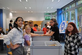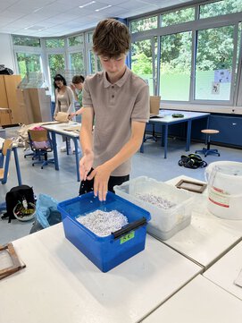 Bei der Mitmachaktion am Freitag konnten die Mitschülerinnen und Mitschüler das Papierschöpfen ausprobieren.